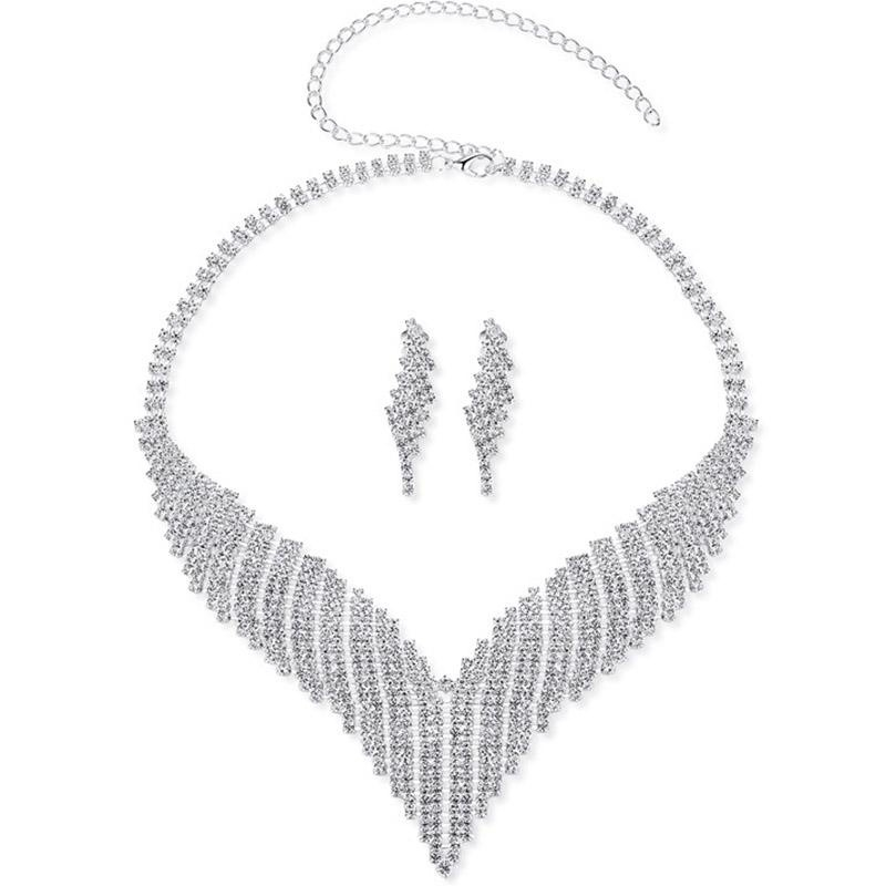 Set bijuterii dama, colier si cercei cu strasuri din pietre zirconiu, pentru evenimente, ocazii, placat cu aur 18K, extensie reglabila, Tessero, argintiu