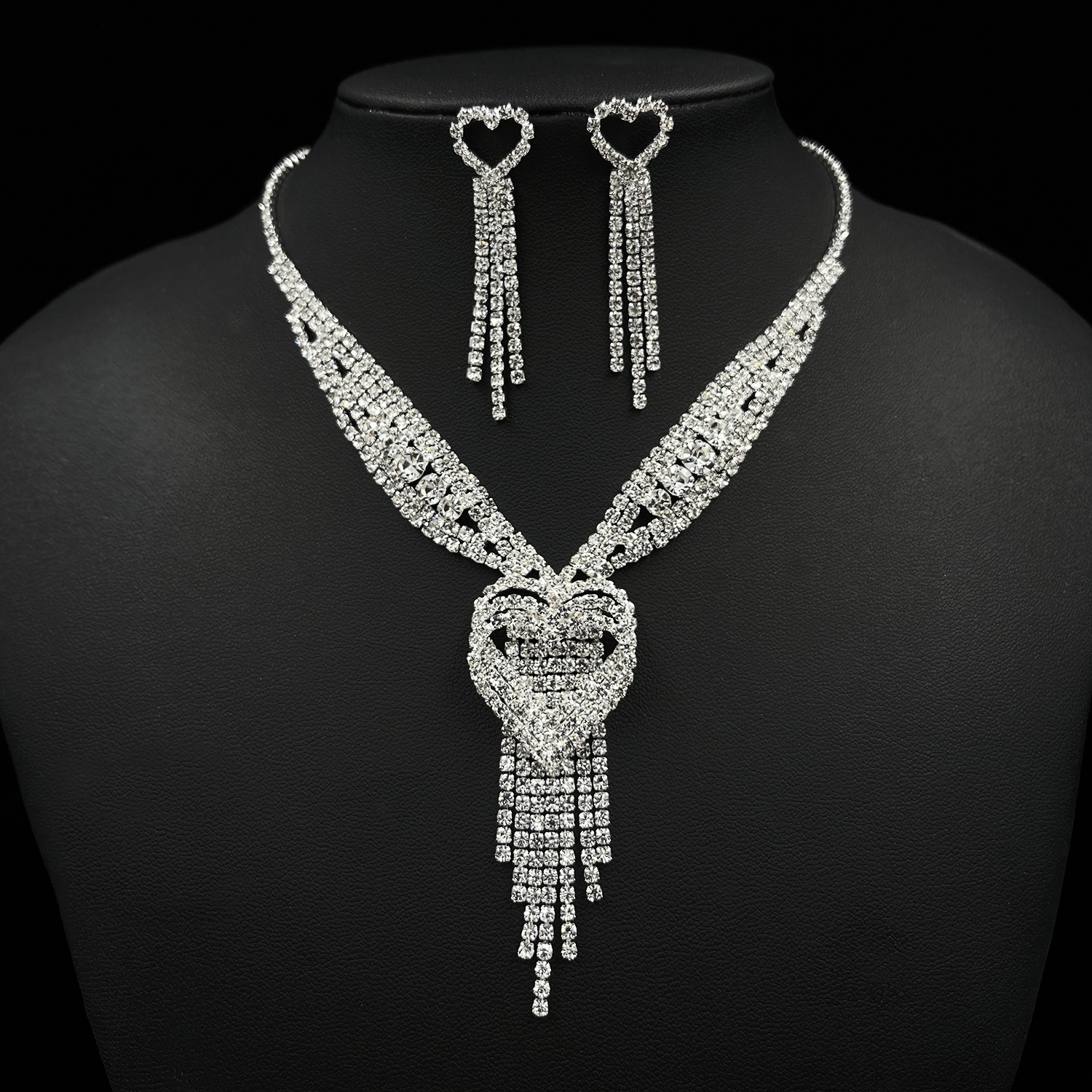Set bijuterii dama, colier si cercei rain drop, pentru evenimente, ocazie, strasuri din pietre zirconiu, model in forma de inima, Tessero, argintiu