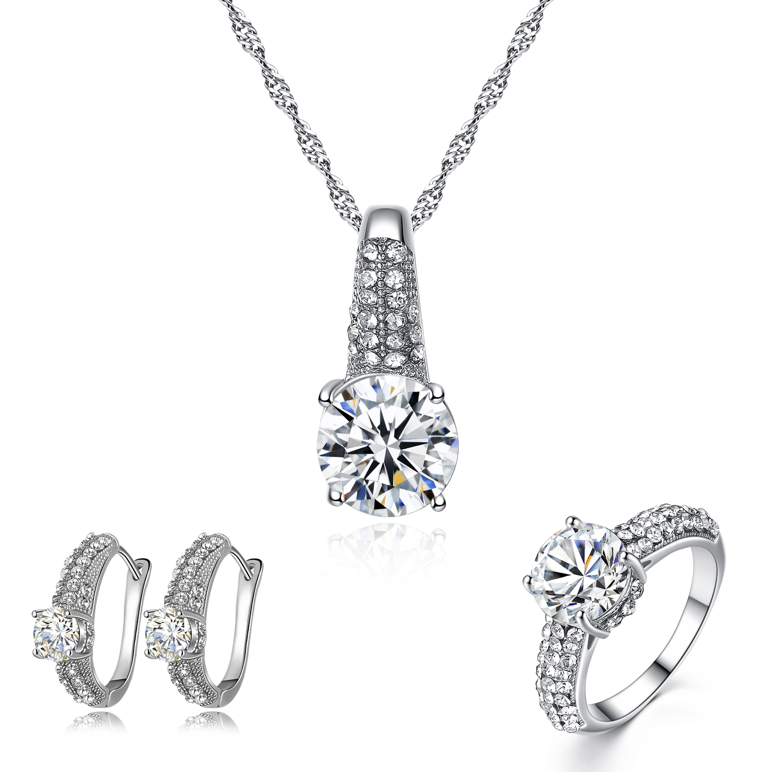 Set bijuterii dama, lantisor cu pandantiv. cercei si inel, pietre irconiu, placat cu aur alb 18K