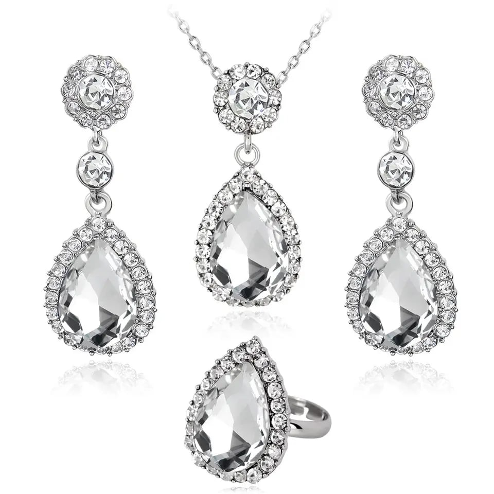 Set bijuterii dama, lantisor cu pandantiv. cercei si inel, pietre zirconiu, placat cu aur alb 18K