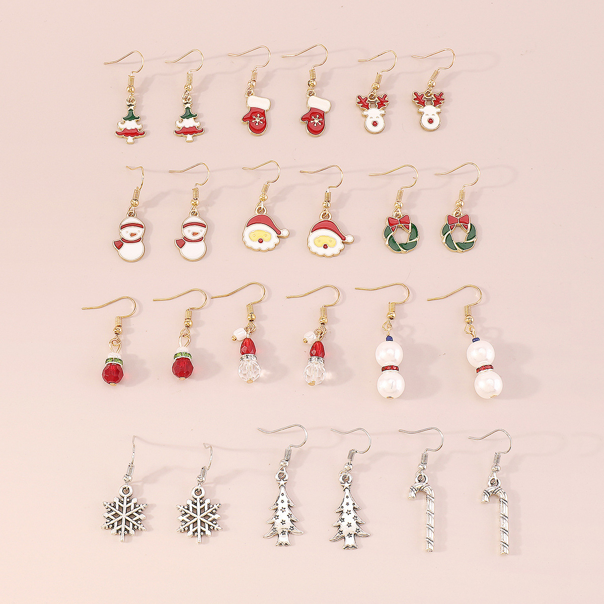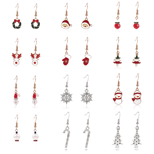 Set de 12 perechi de cercei de dama diferite modele cu tematica de Craciun, om de zapada, brad de craciun si Mos Craciun, Tessero. auriu si argintiu