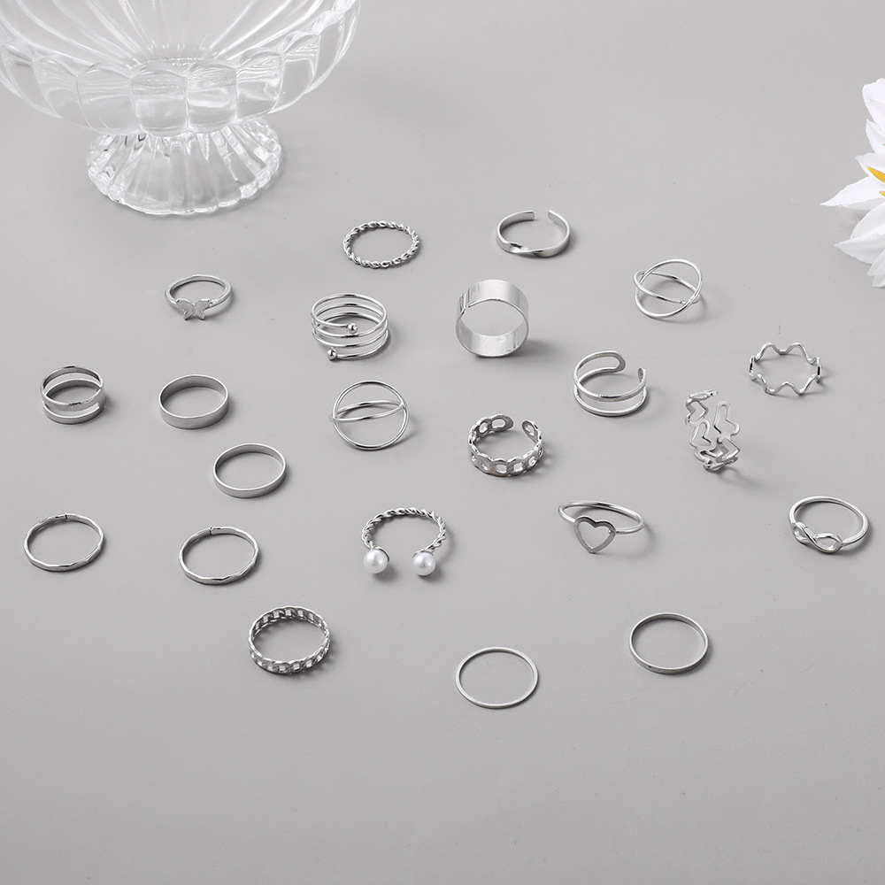 Set de 22 de inele de dama, placate cu aur 18K, diferite modele cu fluturi, inimioare si perle, Tessero, argintiu