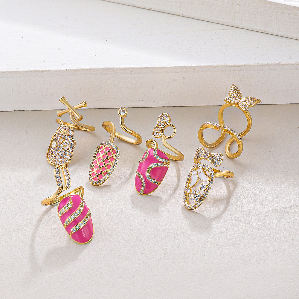 Set de 6 inele pentru unghii, model pentru varful degetelor, forma de cap de mort si fluture, pietre zirconiu, placat cu aur 18K, marime reglabila, Tessero, auriu si roz