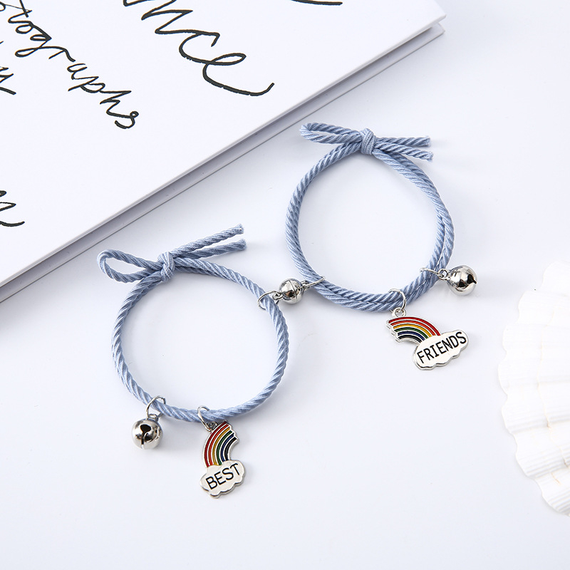 Set de doua bratari cu magnet si clopotel tip snur pentru prieteni, lucrata manual, model in forma de curcubeu cu Best friends, marime reglabila, albastru