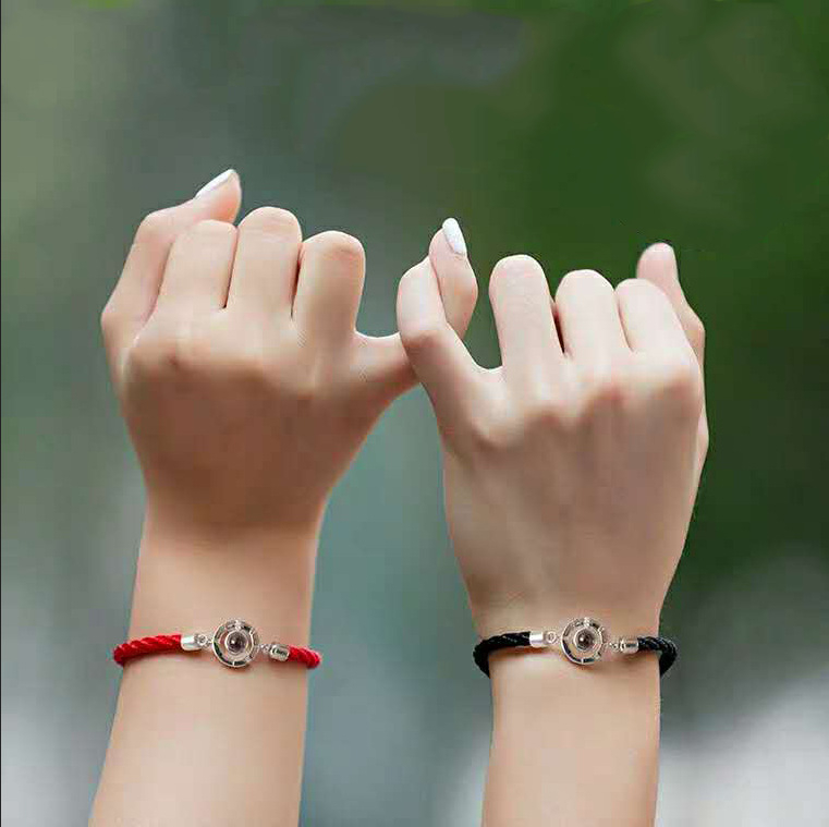 Set de doua bratari din textil pentru cupluri, prieteni, model cu proiectie in 100 limbi Te iubesc, unisex, marime reglabila, Tessero, negru si rosu