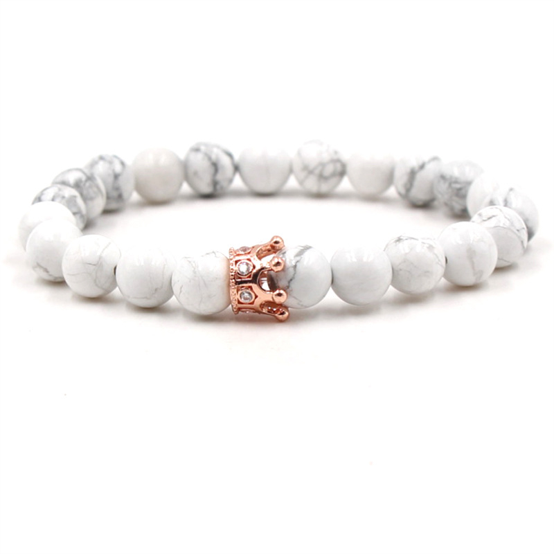 Set de doua bratari elastice pentru cupluri, prieteni, din piatra semipretioasa, roca vulcanica, model cu coroana, unisex, Tessero, alb si negru