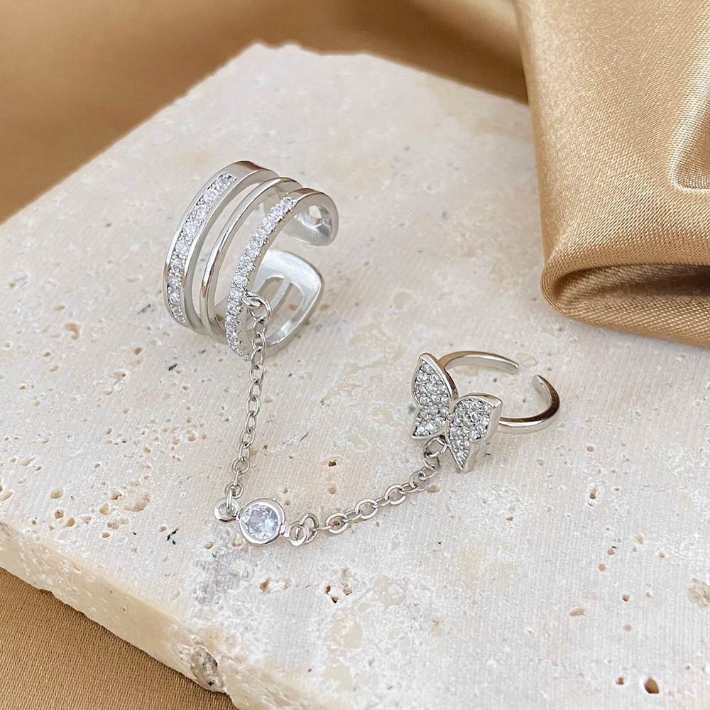 Set de doua inele reglabile conectate cu lantisor, model cu fluture, placat cu argint, pietre zirconiu, marime reglabila, Tessero, argintiu