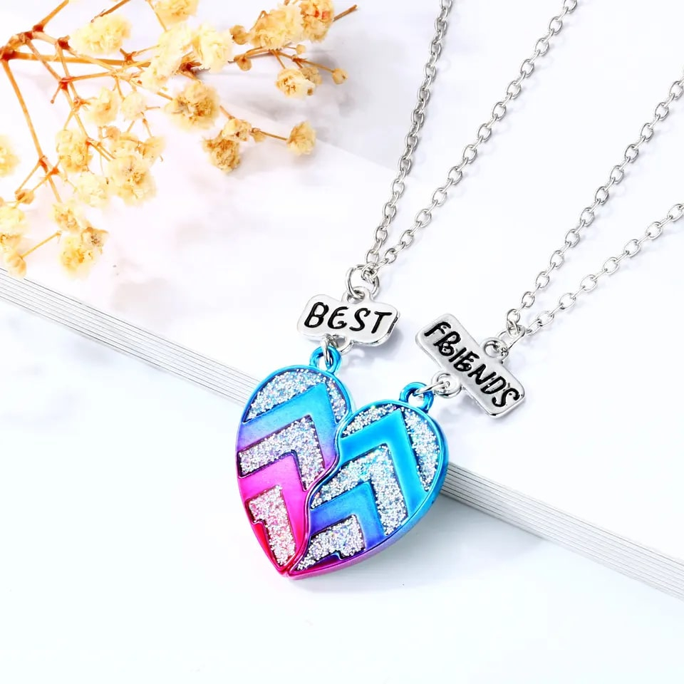 Fiecare lantisor are un pandantiv in forma de inima, decorat cu sclipici stralucitor, pentru un plus de stil si eleganta. De asemenea, charm-ul cu "best friends forever" adauga un mesaj emotionant si plin de semnificatie, care va aminti intotdeauna de prietenia voastra puternica.