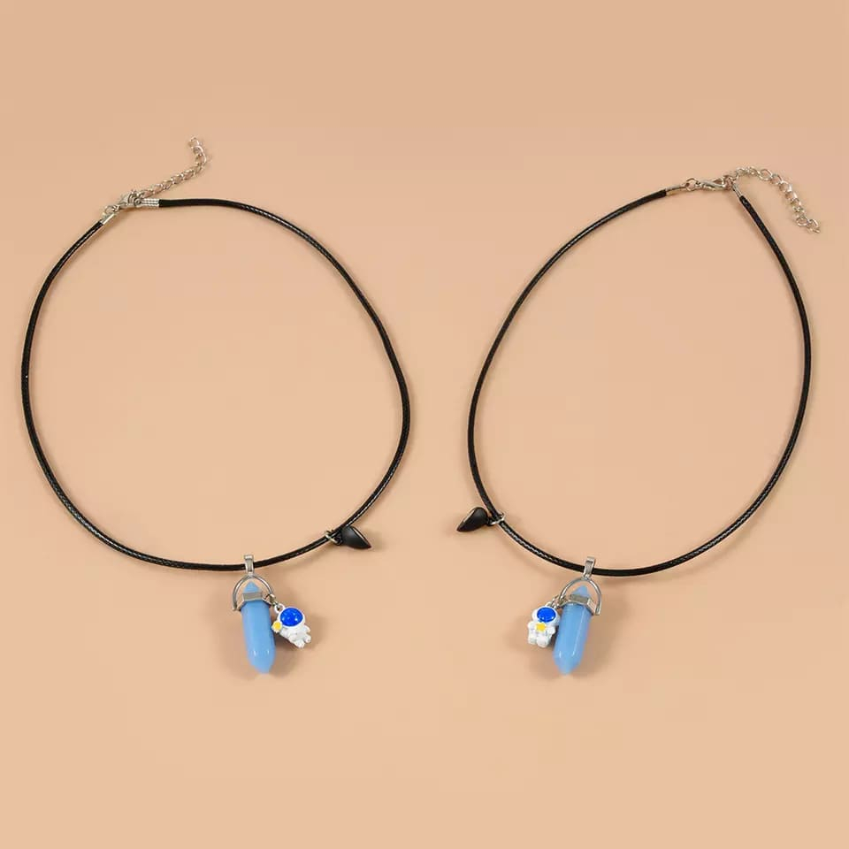 Set de doua lantisoare din piele magnetice pentru cupluri, prieteni cu pandantiv vindecator in forma de hexagon si astronaut, charm in forma de inima, cristal de ametist, fosforescent, unisex, negru