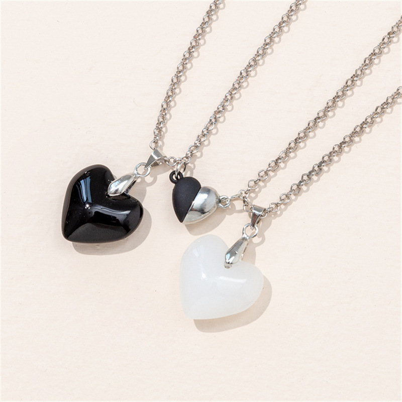 Set de doua lantisoare magnetice cu cartonas pentru cupluri, prieteni cu pandantiv vindecator in forma de inimioara din piatra semipretioasa, unisex, negru si alb