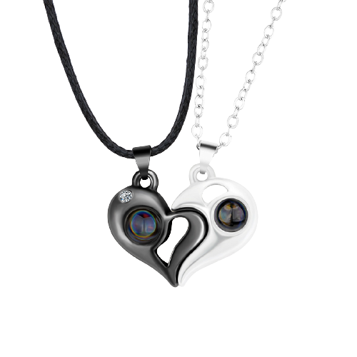 Set de doua lantisoare proiectie in 100 de limbi "Te iubesc" cu pandantiv in forma de inima cu magnet pentru cuplu, prieteni, argintiu si negru