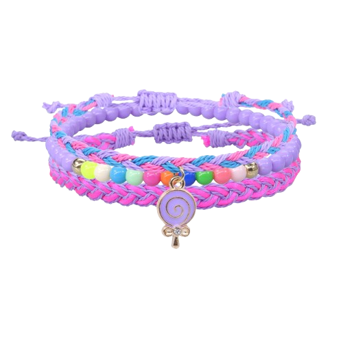 Set trei bratari tip snur din textil impletit si margele, realizat manual, marime reglabila, charm-uri animate, Tessero, mov