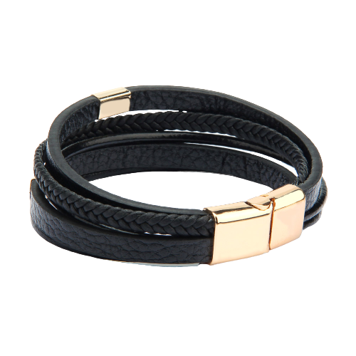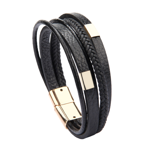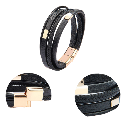 Bratara din piele naturala cu siraguri multiple, model cu placute aurii din otel inoxidabil, prindere magnet, Tessero, negru si auriu