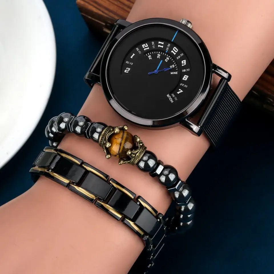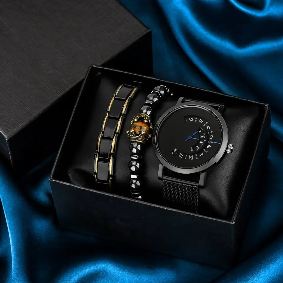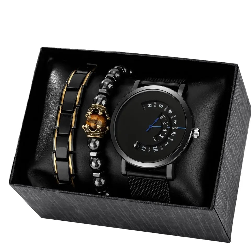 Setul cadou Tessero contine un ceas analog cu afisaj circular si doua bratari elegante, perfecte pentru a-ti completa tinuta cu un stil modern si sofisticat. Acest model de ceas deosebit, echipat cu un mecanism quartz de calitate superioara si un cronograf precis, este fabricat cu o atentie deosebita la detalii si finisaje impecabile. In plus, una dintre bratari este magnetica terapeutica, care imbunatateste circulatia sanguina si reducerea durerii, ceea ce il face un cadou ideal pentru cei dragi care sunt interesati de sanatatea si bunastarea lor. Cu o culoare neagra eleganta, acest set cadou este perfect pentru orice ocazie speciala, fie ca este vorba de un cadou de Craciun, ziua de nastere sau o aniversare importanta.