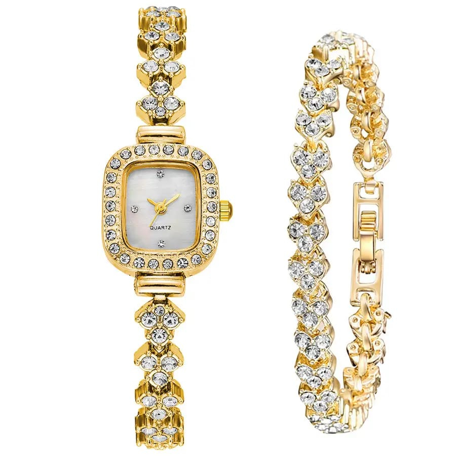 Set ceas analog de dama si bratara model tip Tennis in forma de inimioare, mecanism quartz, otel inoxidabil, Tessero, auriu