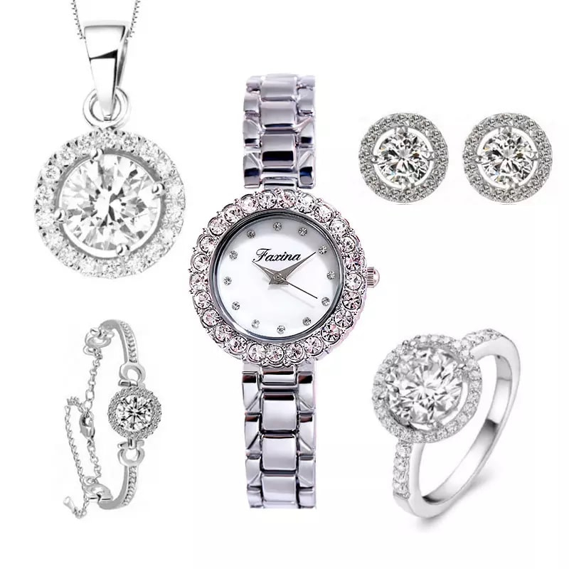 Set de bijuterii de dama, lantisor cu pandantiv, bratara, cercei, inel si ceas de mana, mecanism quartz, otel inoxidabil, pietre zirconiu, argintiu, cutie cadou, Tessero