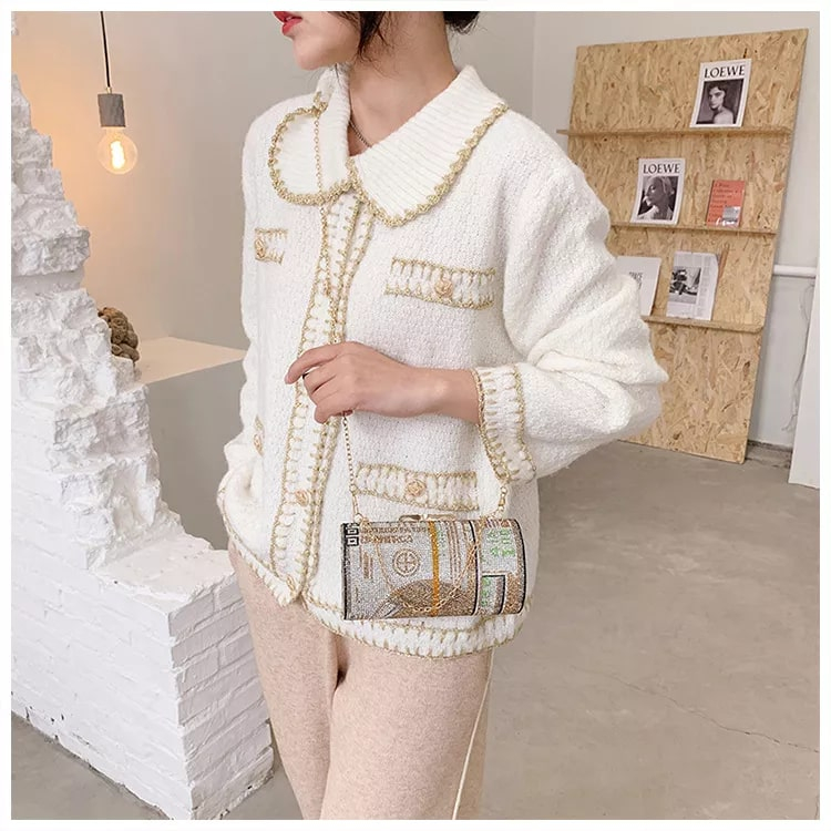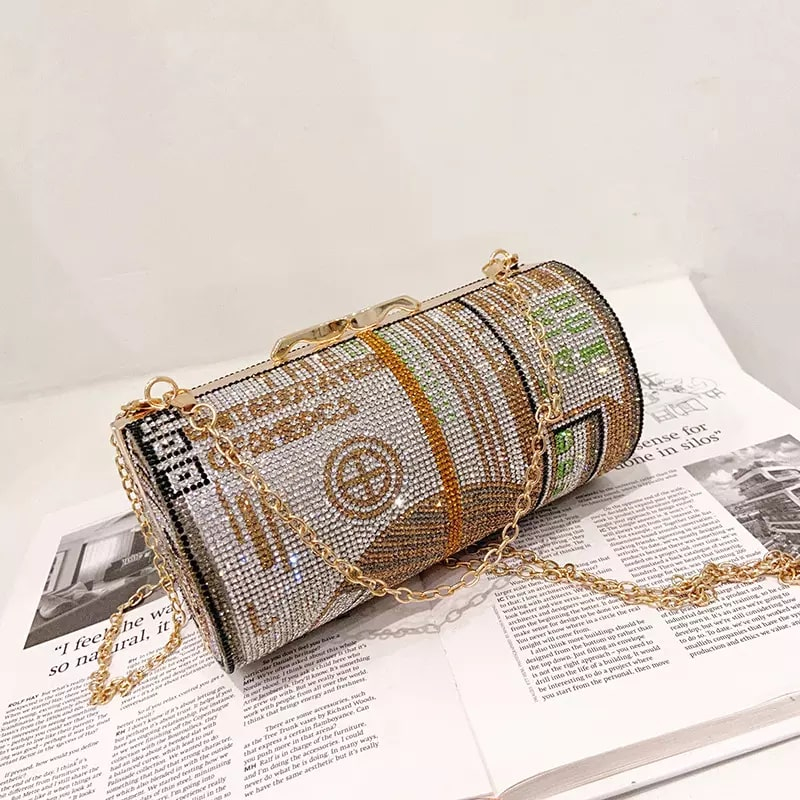 Geanta de dama pentru umar tip clutch, in forma de cilindru cu strasuri, model cu bancnota dolar, maner umar, Tessero, auriu