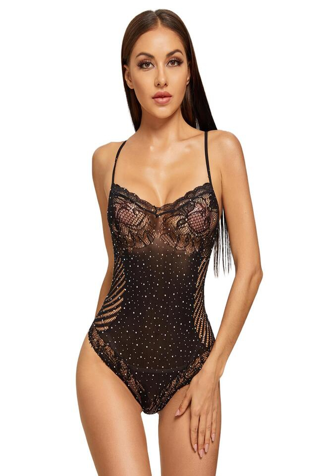Lenjerie sexy de dama decorata cu pietre zirconiu, model body, marime universala, dantela, Tessero, negru
