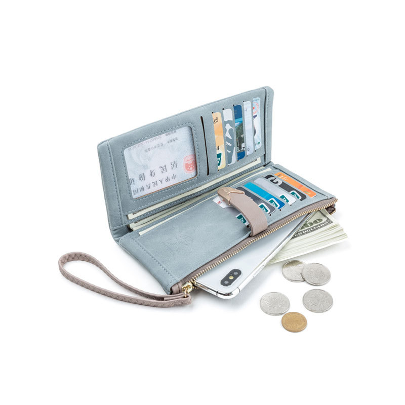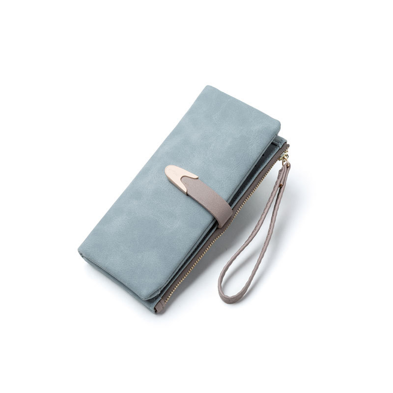 Portofel de dama din piele, compartimentat, model in forma de plic cu bareta, inchidere cu fermoar si capse, Tessero, albastru si maro