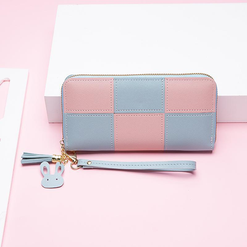 Portofel de dama dreptunghiular din piele ecologica cu maner, compartimente multiple, model in doua culori, inchidere cu fermoar, Tessero, roz si albastru